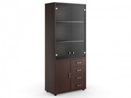 Толщина столешницы-- 57 мм. Толщина топов тумб—25 мм.Стеклянные двери шкафов выполнены из тонированного стекла. Задние стенки шкафов из ДСП.Опоры столов регулируются по высоте.Верхний ящик тумбы закрывается на замок.